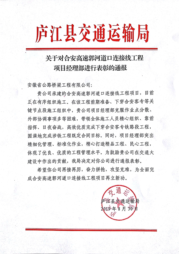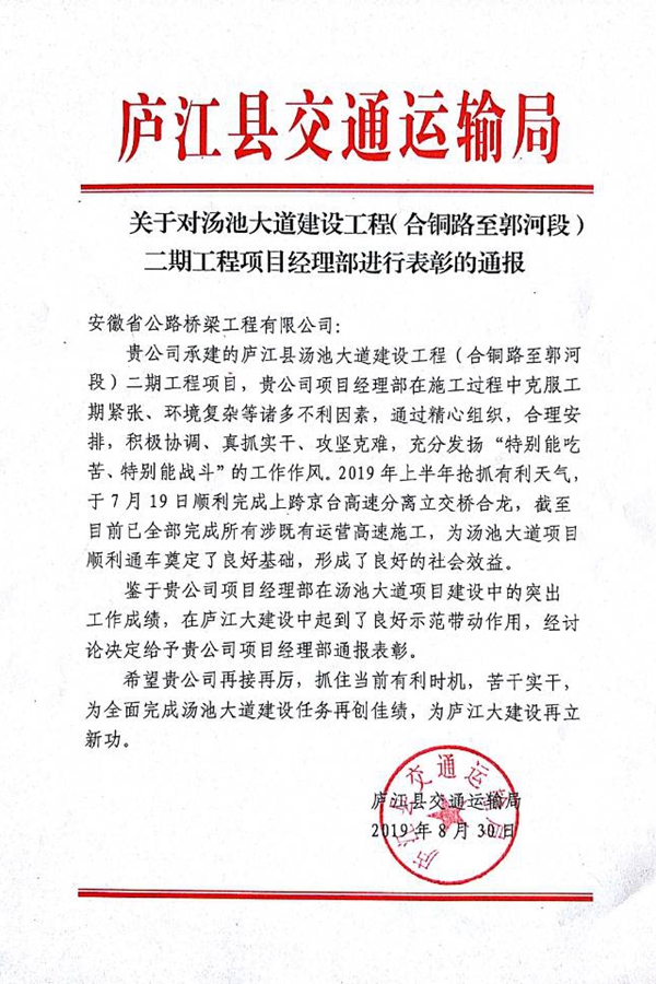 近日,廬江縣交通運輸局發(fā)文對湯池大道二期、郭柯路兩項目進(jìn)行通報表彰,高度肯定了項目團隊管理水平及工程形象進(jìn)度等工作。