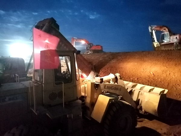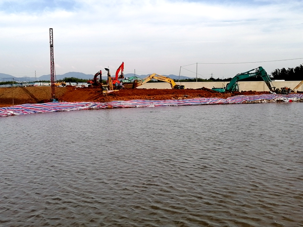 巢湖市東外壞旗山撇洪溝,位于巢湖鼓山腳下,連接清溪河支流,連日降雨,清溪河水位暴漲,防汛壓力巨大,經(jīng)開區(qū)的人民生命和財(cái)產(chǎn)安全受到嚴(yán)重威脅。經(jīng)巢湖市政府研究決定,在旗山撇洪溝和清溪河支流交匯處筑壩,將撇洪溝東側(cè)低洼處作為清溪河支流泄洪預(yù)備區(qū),以應(yīng)對(duì)清溪河水位暴漲危險(xiǎn)。接到汛情指令,巢湖市亞父路項(xiàng)目部迅速出動(dòng),組建防汛突擊隊(duì),調(diào)集挖掘機(jī)、裝載機(jī)等機(jī)械設(shè)備迅速奔赴搶險(xiǎn)一線,連續(xù)奮戰(zhàn)兩天三夜,填筑黃土近10000方,碎石1500方,拋石700噸,圓滿完成了底寬22米,上寬10米,高5米,長110米的筑壩任務(wù),確保了經(jīng)開區(qū)的人民生命和財(cái)產(chǎn)安全。