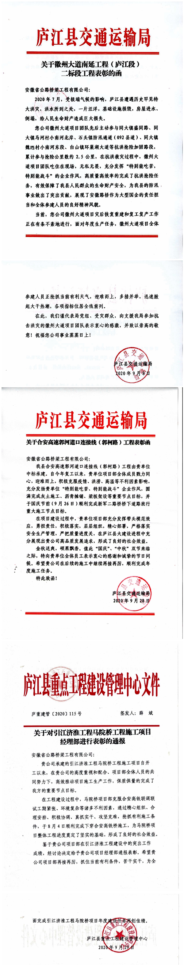 近日,廬江縣交通運輸局、廬江縣重點工程建設(shè)管理中心先后發(fā)來表彰信,對公司承建的徽州大道南延工程(廬江段)二標(biāo)段、合安高速郭河道口連接線(郭柯路)工程、引江濟(jì)淮馬院橋工程項目戰(zhàn)疫情、抗洪水、搶進(jìn)度、樹形象,高標(biāo)準(zhǔn)、高質(zhì)量推進(jìn)施工生產(chǎn)給予表揚和感謝。