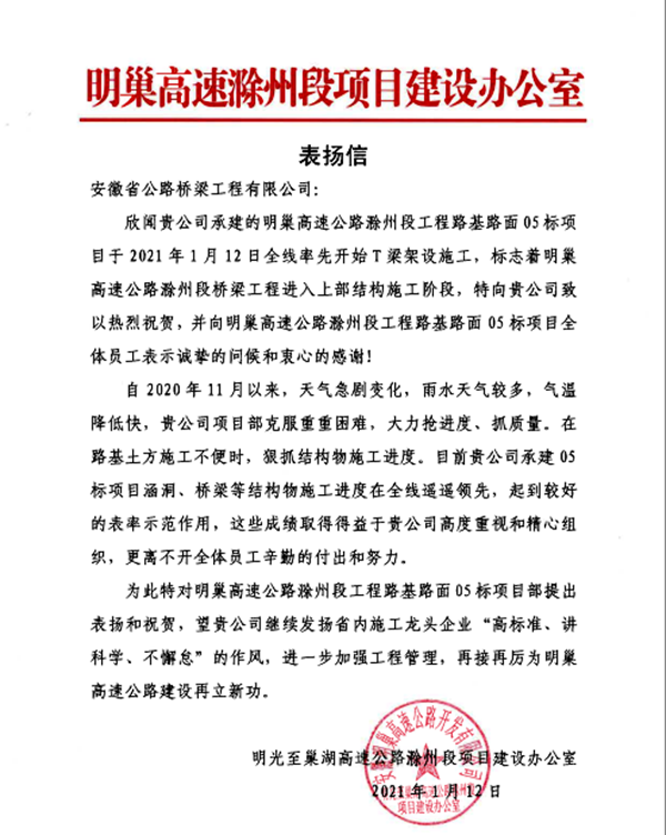 1月12日,明巢高速滁州段項(xiàng)目辦給公司來信,對公司承建的明巢高速05標(biāo)在全線率先開始T梁架設(shè)進(jìn)行表揚(yáng)。