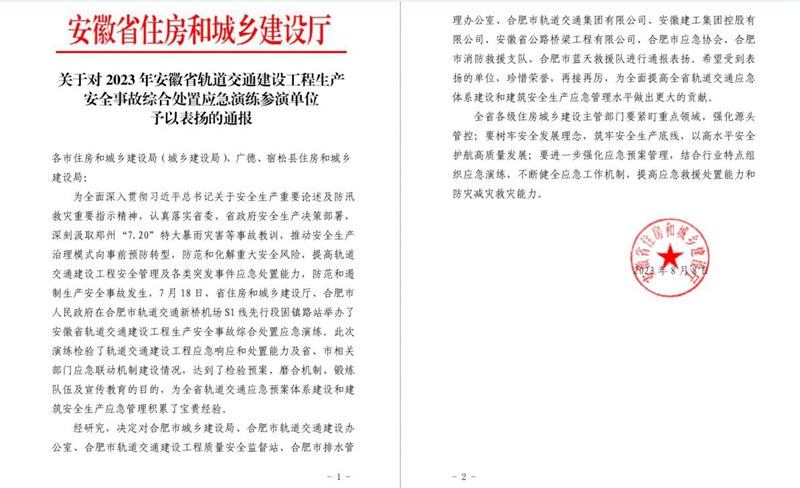 近日,安徽省住房和城鄉(xiāng)建設(shè)廳發(fā)文通報表揚安徽建工集團控股有限公司、安徽省公路橋梁工程有限公司在2023年度安徽省軌道交通建設(shè)工程綜合處置應(yīng)急演練中所作出的突出貢獻和優(yōu)異表現(xiàn)。