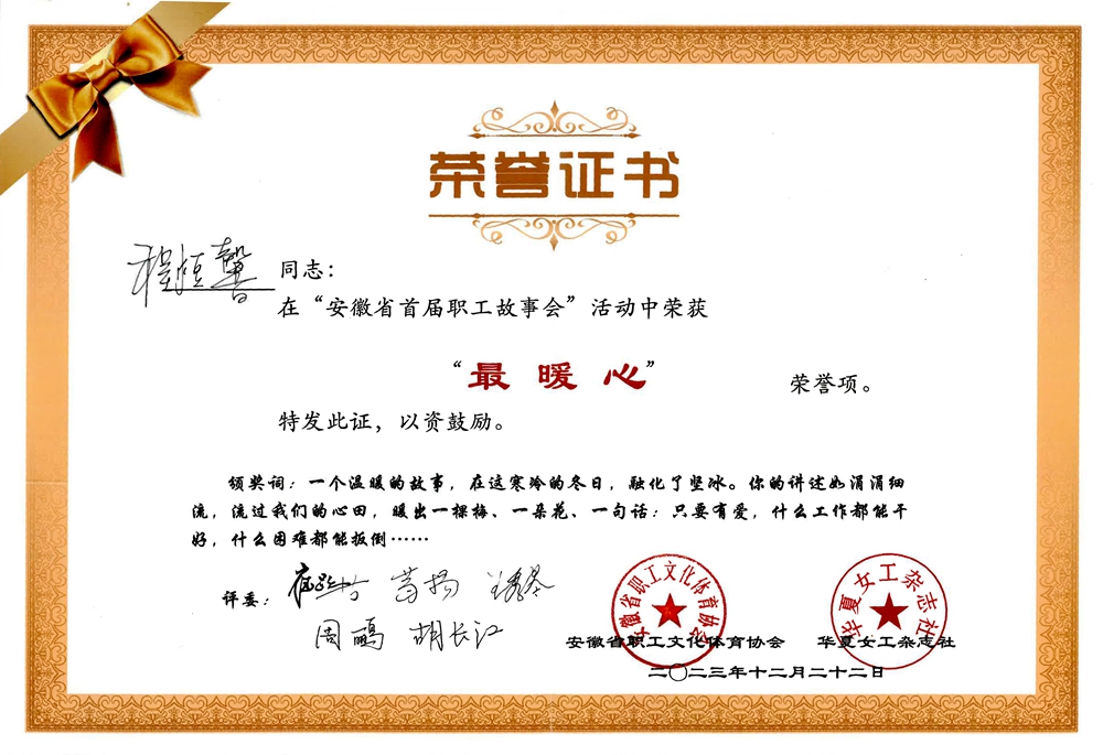 12月22日上午,由安徽省職工文體協(xié)會、華夏女工雜志社主辦,安徽省職工演講聯(lián)合會協(xié)辦的“講好職工故事·建設美好安徽——安徽省首屆職工故事會”決賽在合肥順利舉辦,由公司選送的選手程煜馨講述的《人生信條-橋柱子》在決賽21個作品中脫穎而出,代表公司斬獲“安徽省職工故事會·最暖心”獎。