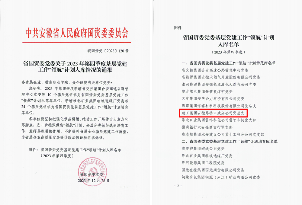 近日,安徽省國資委發(fā)布《關(guān)于2023年第四季度基層黨建工作“領(lǐng)航”計劃入庫情況的通報》,安徽路橋市政分公司黨總支成功入選省國資委黨委基層黨建工作“領(lǐng)航”計劃示范庫。