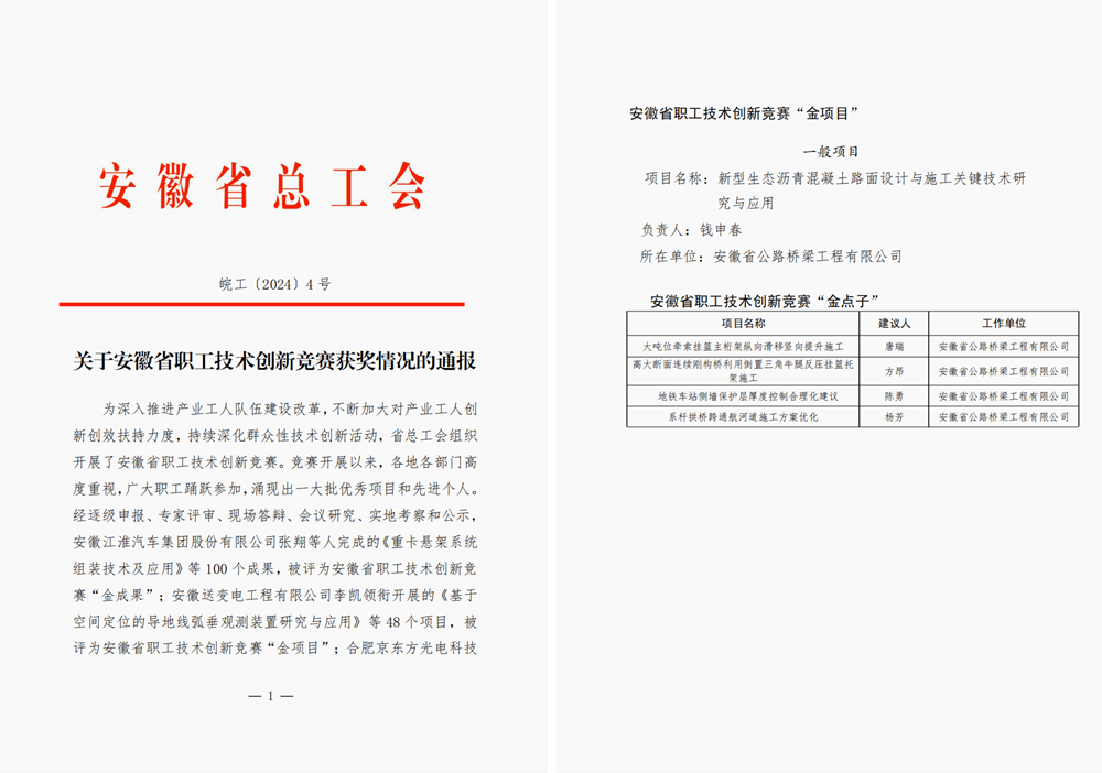 近日,安徽省總工會(huì)發(fā)布《關(guān)于安徽省職工技術(shù)創(chuàng)新競賽獲獎(jiǎng)情況的通報(bào)》,公司報(bào)送的《新型生態(tài)瀝青混凝土路面設(shè)計(jì)與施工關(guān)鍵技術(shù)研究與應(yīng)用》獲評(píng)“金項(xiàng)目”,《大噸位牽索掛籃主桁架縱向滑移豎向提升施工》等4項(xiàng)建議獲評(píng)“金點(diǎn)子”。