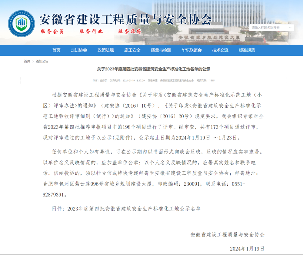 公司一批項目獲評“安徽省建筑安全生產標準化工地”