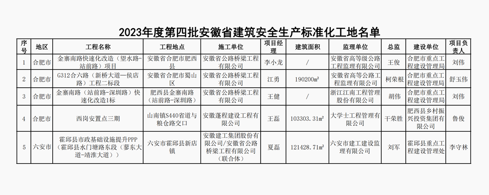 近日,安徽省建設工程質量與安全協(xié)會公布2023年度第四批安徽省建筑安全生產標準化工地名單,由公司承建的金寨南路快速化改造(望水路-站前路)項目、G312合六路(新橋大道-侯店路)工程二標段、金寨南路(站前路-深圳路)快速化改造1標、霍邱縣市政基礎設施提升PPP(霍邱縣水門塘路東段(蓼東大道-靖淮大道))、肥西文旅西崗安置點三期等5個項目光榮上榜。