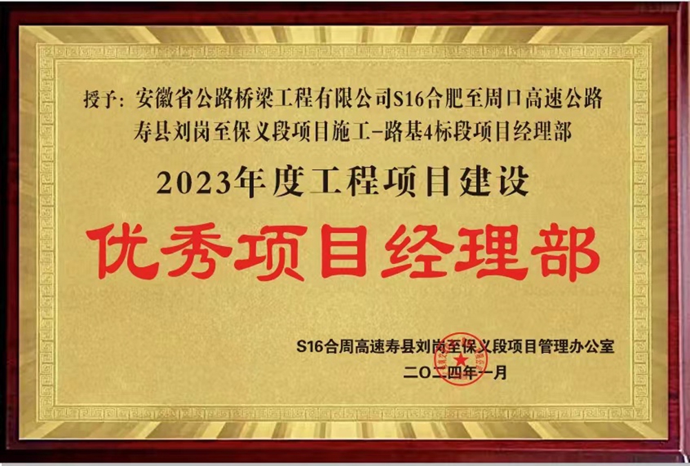 淮南交控(集團(tuán))有限公司S16合周高速壽縣劉崗至保義段項(xiàng)目辦發(fā)布2023年度“五比五看”評比得分通報(bào),公司承建的S16合周高速4標(biāo)東淝河大橋項(xiàng)目在全線脫穎而出,位列年度綜合考評第一名,獲通報(bào)表揚(yáng),并被授予“優(yōu)秀項(xiàng)目經(jīng)理部”榮譽(yù)稱號。