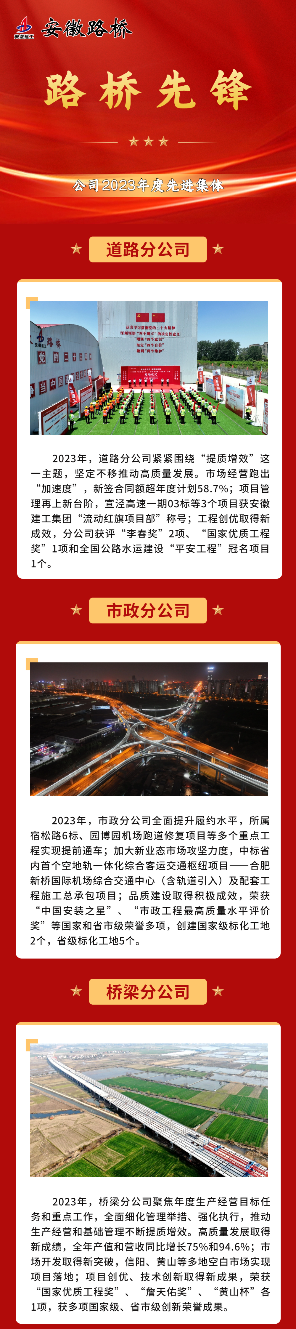 【路橋先鋒】公司2023年度先進集體風采展示 發(fā)布時間:2024年03月15日 來源:黨委組織部(人力資源部、黨委宣傳部)、所屬各單位 發(fā)布人:黨委組織部(人力資源部、黨委宣傳部) 作者: 瀏覽:2557次