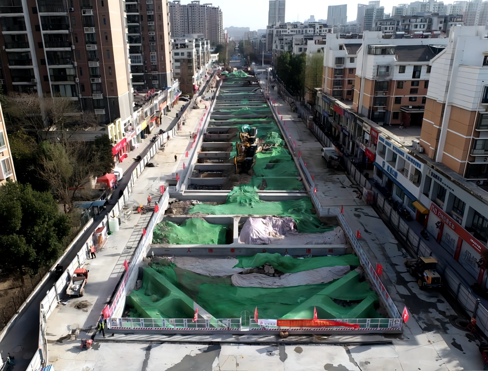 史河路站位于青陽路與史河路交口,地處老城區(qū),周邊小區(qū)密集、地下管線錯綜復(fù)雜且存在高強(qiáng)度中風(fēng)化砂巖,作業(yè)空間非常有限,施工體量大、難度高。項目部提前編制開挖方案、組織專家論證、多次召開專項技術(shù)交底會,嚴(yán)格做好施工及安全工作交底、管控,并積極與街道、社區(qū)溝通協(xié)調(diào),保障了施工順利推進(jìn)。