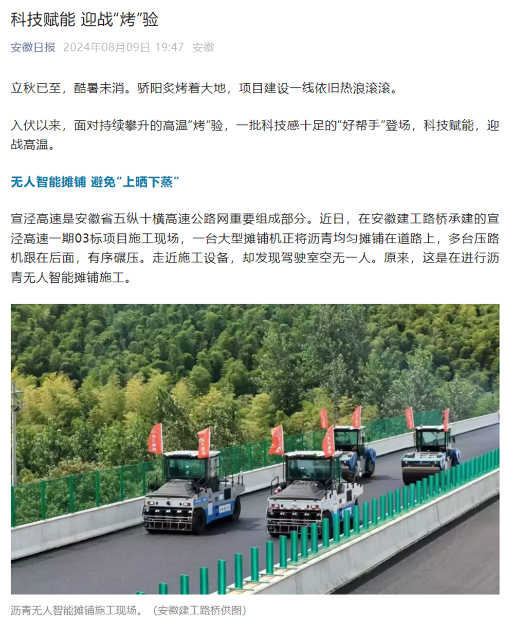 宣涇高速是安徽省五縱十橫高速公路網(wǎng)重要組成部分。近日,在安徽建工路橋承建的宣涇高速一期03標項目施工現(xiàn)場,一臺大型攤鋪機正將瀝青均勻攤鋪在道路上,多臺壓路機跟在后面,有序碾壓。走近施工設備,卻發(fā)現(xiàn)駕駛室空無一人。原來,這是在進行瀝青無人智能攤鋪施工。