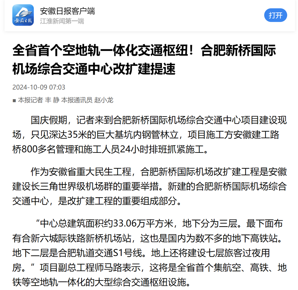 國(guó)慶前后,安徽新聞聯(lián)播、安徽日?qǐng)?bào)、江淮晨報(bào)等多家省級(jí)主流媒體紛紛聚焦公司承建的涇青高速04標(biāo)、徐淮阜高速淮北段、合肥新橋國(guó)際機(jī)場(chǎng)綜合交通中心等重點(diǎn)項(xiàng)目建設(shè)情況進(jìn)行報(bào)道。