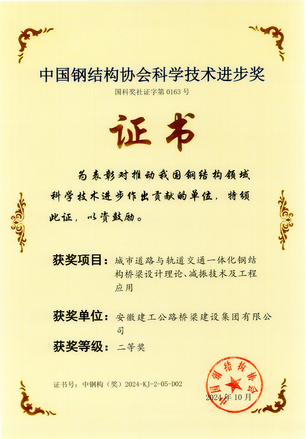 10月22日,“中國鋼結(jié)構(gòu)協(xié)會(huì)成立40周年紀(jì)念大會(huì)暨2024中國鋼結(jié)構(gòu)大會(huì)”在北京召開,會(huì)議對(duì)2024年度中國鋼結(jié)構(gòu)協(xié)會(huì)科學(xué)技術(shù)進(jìn)步獎(jiǎng)、技術(shù)創(chuàng)新獎(jiǎng)進(jìn)行了頒獎(jiǎng)。公司參與的“城市道路與軌道交通一體化鋼結(jié)構(gòu)橋梁設(shè)計(jì)理論、減振技術(shù)及工程應(yīng)用”項(xiàng)目榮獲科學(xué)技術(shù)進(jìn)步獎(jiǎng)二等獎(jiǎng)。