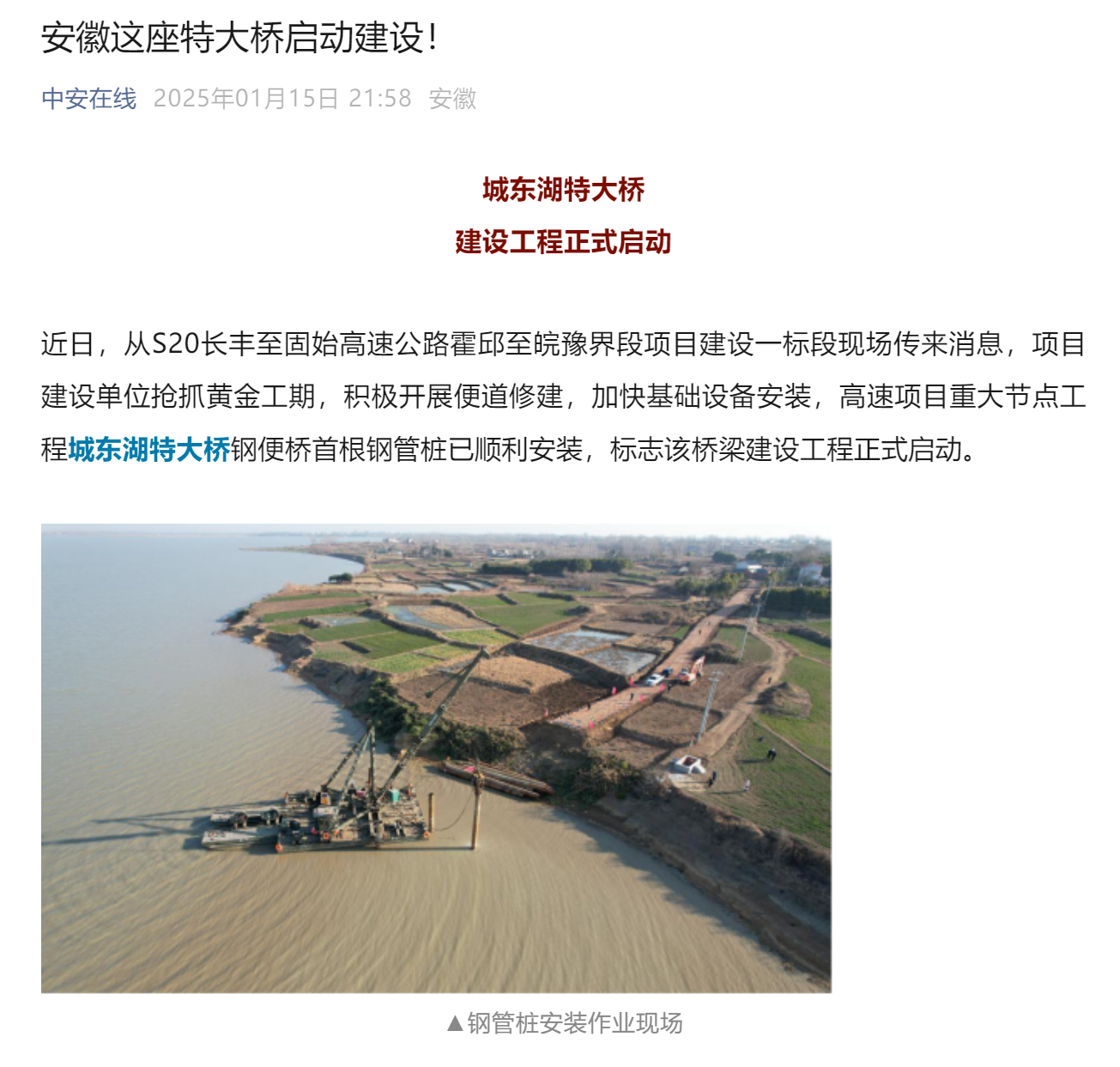 近日,從S20長豐至固始高速公路霍邱至皖豫界段項(xiàng)目建設(shè)一標(biāo)段現(xiàn)場傳來消息,項(xiàng)目建設(shè)單位搶抓黃金工期,積極開展便道修建,加快基礎(chǔ)設(shè)備安裝,高速項(xiàng)目重大節(jié)點(diǎn)工程城東湖特大橋鋼便橋首根鋼管樁已順利安裝,標(biāo)志該橋梁建設(shè)工程正式啟動(dòng)。