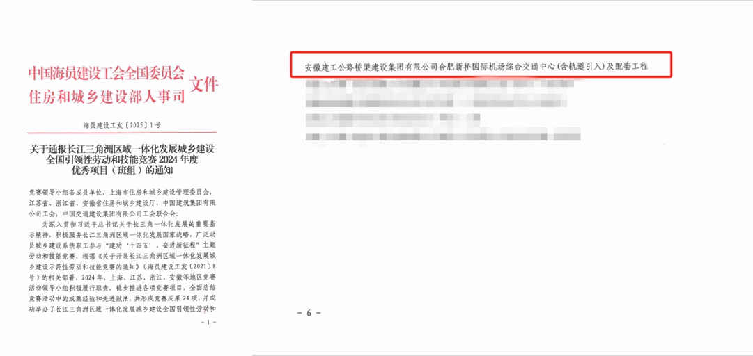 近日,中國(guó)海員建設(shè)工會(huì)、住房和城鄉(xiāng)建設(shè)部人事司對(duì)長(zhǎng)江三角洲區(qū)域一體化發(fā)展城鄉(xiāng)建設(shè)全國(guó)引領(lǐng)性勞動(dòng)和技能競(jìng)賽2024年度優(yōu)秀項(xiàng)目(班組)進(jìn)行表彰。公司承建的合肥新橋國(guó)際機(jī)場(chǎng)綜合交通中心項(xiàng)目榜上有名。