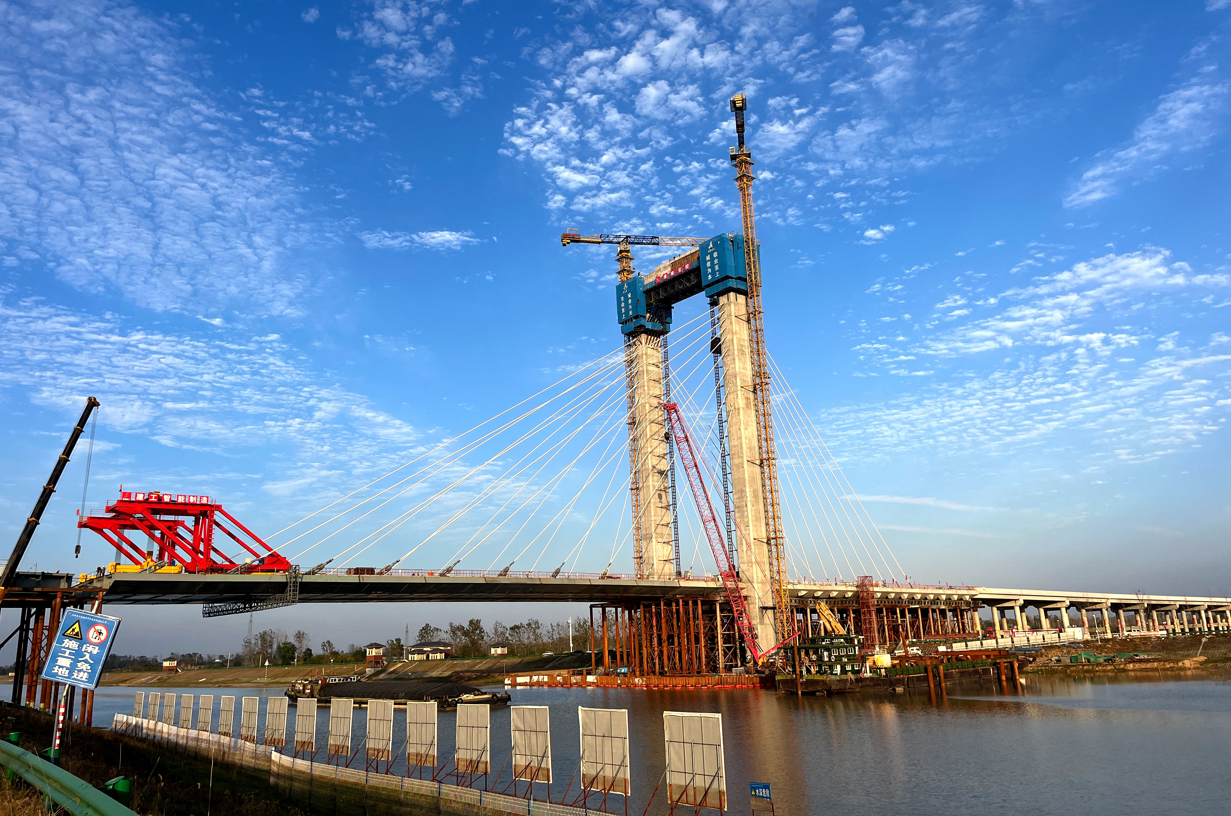 在各參建單位的共同努力下,如今已建成的東淝河特大橋,一橋飛架東西,高達(dá)百米的大橋主塔雄姿威武,猶如一扇“天門”,屹立在悠悠淝水岸邊。