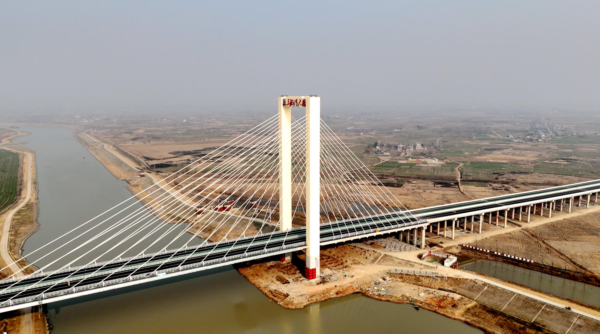 東淝河特大橋全長4.19千米,橫跨壽縣雙廟集鎮(zhèn)與保義鎮(zhèn),主橋?yàn)?5+175米獨(dú)塔斜拉橋,塔柱采用“門”型造型結(jié)構(gòu),塔高109.553米。
