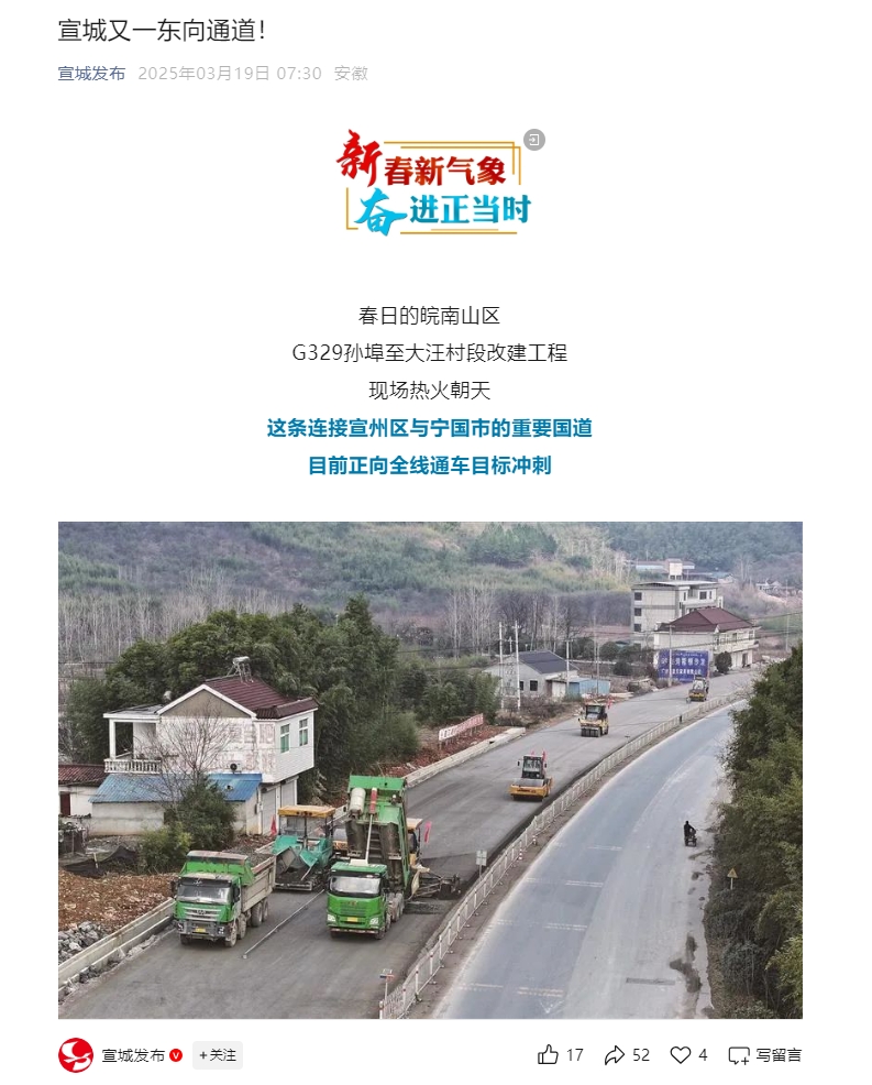 春日的皖南山區(qū),G329孫埠至大汪村段改建工程現(xiàn)場熱火朝天。攤鋪機(jī)、壓路機(jī)與運(yùn)輸車輛轟鳴交織,滾燙的瀝青蒸騰起陣陣白霧。這條連接宣州區(qū)與寧國市的重要國道,目前正向全線通車目標(biāo)沖刺。作為融入長三角的重要通道,項目建成后,宣城至寧國通行時間將大大縮短,惠及沿線10萬余群眾。