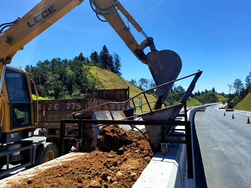 中分填土實現零污染。傳統(tǒng)高速公路中分帶培植用土施工,極易造成路面污染。為解決該難題,公司創(chuàng)新研發(fā)中分帶新澤西護欄間填土漏斗裝置,根據現場護欄尺寸、填土高度,制作填土漏斗,填土施工通過漏斗槽滑入護欄內部,避免外溢,同時漏斗可以在護欄頂部和側面自由滑動,實現中分帶填土零污染施工,有效保證路面清潔施工,較傳統(tǒng)工藝施工效率提高50%左右。