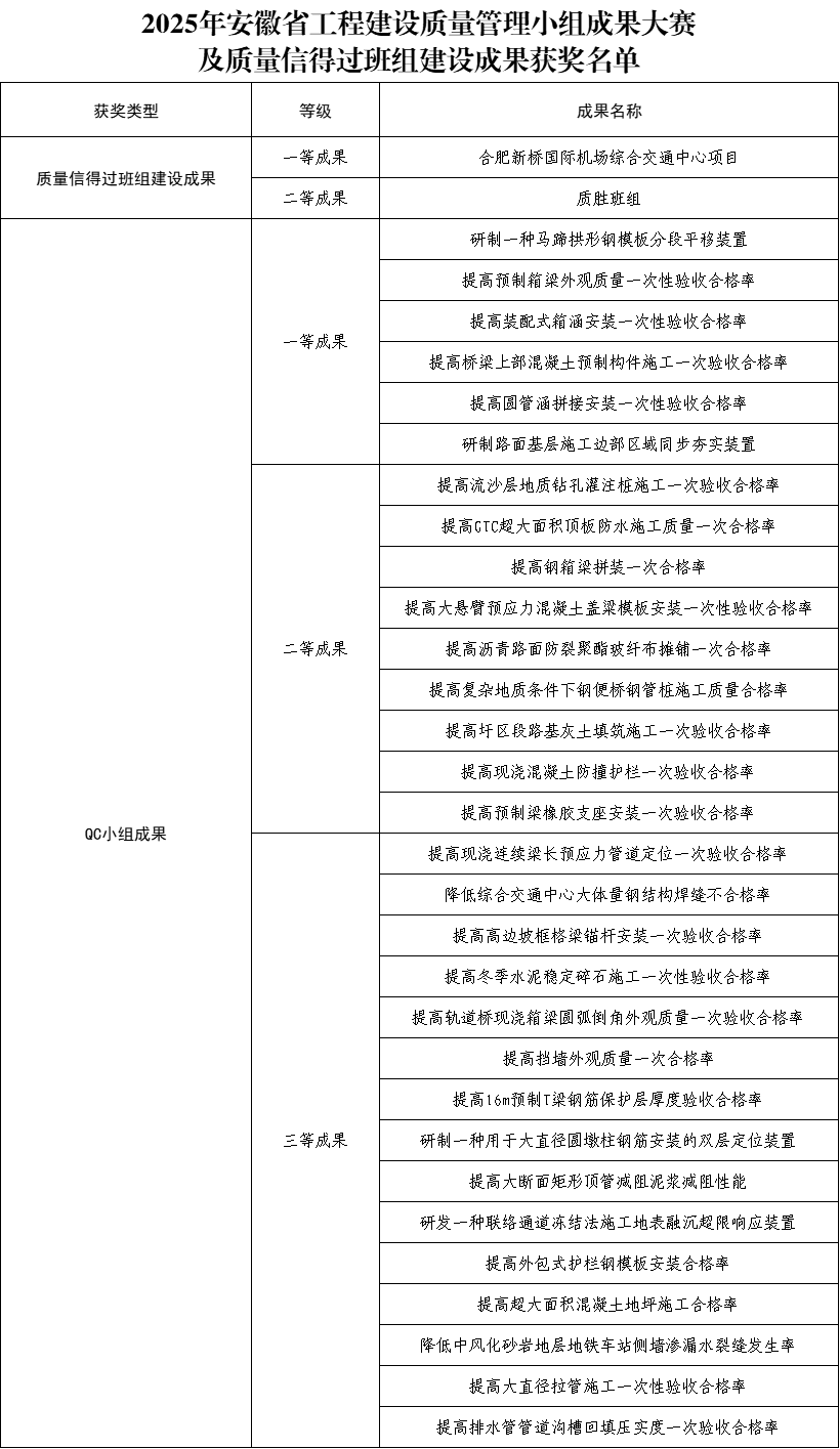 近日,安徽省建設(shè)工程質(zhì)量與安全協(xié)會公布了2025年安徽省工程建設(shè)質(zhì)量管理小組成果大賽及質(zhì)量信得過班組建設(shè)成果獲獎名單,公司申報的30個QC成果及2個班組成果榮獲佳績,其中獲得QC成果一等獎6項、二等獎9項、三等獎15項,班組成果一等獎1項、二等獎1項。