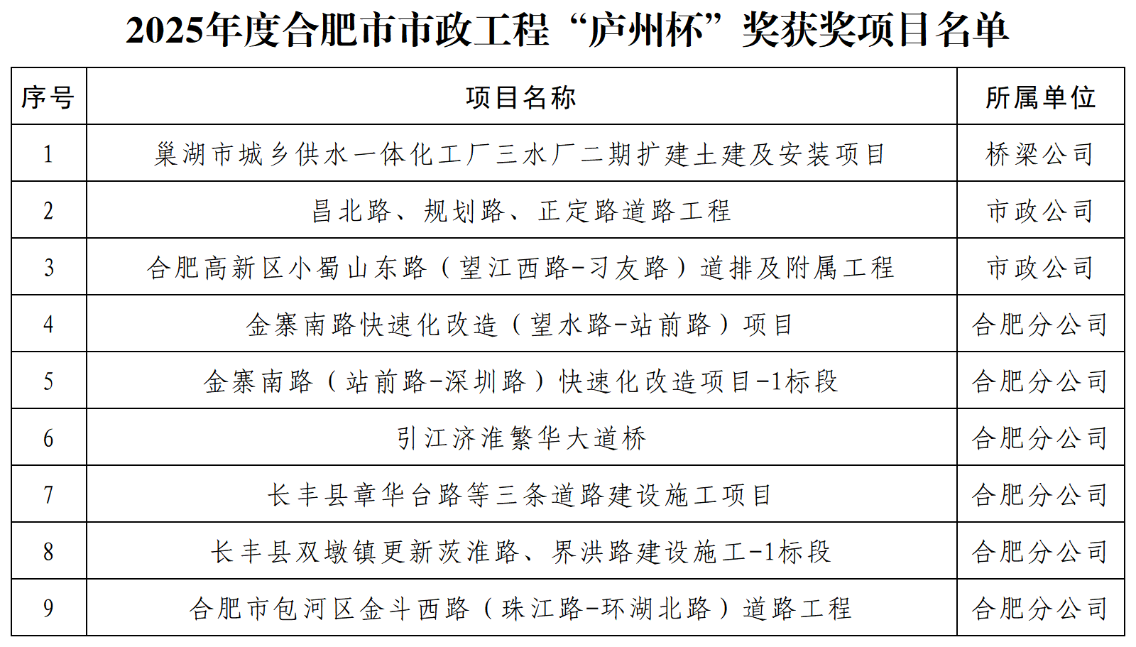 近日,合肥市市政工程協(xié)會(huì)公布了2025年度合肥市市政工程“廬州杯”獎(jiǎng)獲獎(jiǎng)項(xiàng)目名單,公司承建的9個(gè)項(xiàng)目榮譽(yù)登榜。