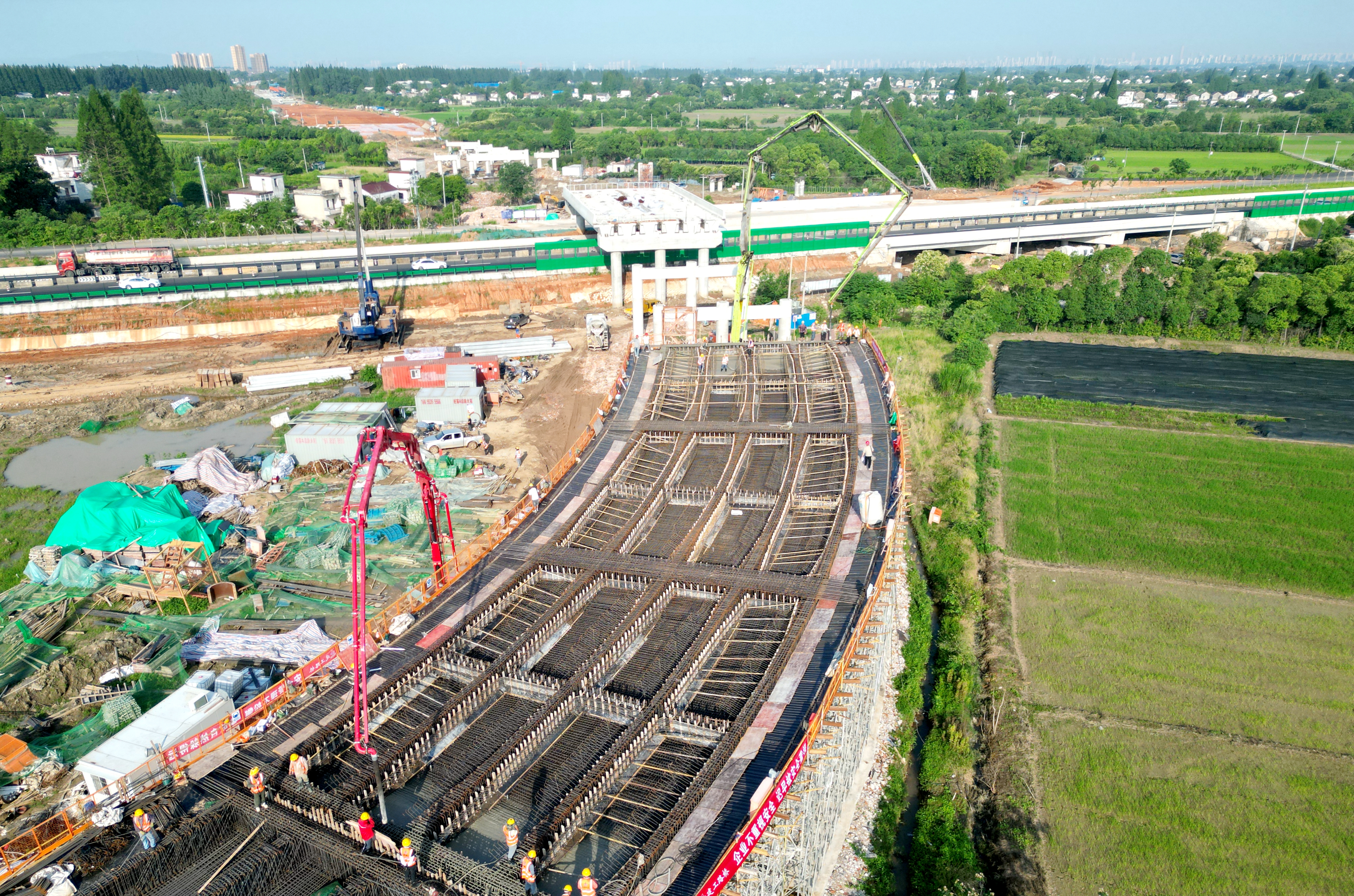 面對梅雨季節(jié)導(dǎo)致的施工便道通行不暢與地方協(xié)調(diào)壓力,項(xiàng)目部超前謀劃,完善施工方案,在交叉路口布置安全防護(hù)并全程值守,同時(shí)在施工便道各個(gè)通行困難地點(diǎn)安排機(jī)械鋪設(shè)鋼板,保證罐車按時(shí)抵達(dá)澆筑點(diǎn)。澆筑過程中嚴(yán)格把控現(xiàn)場工序質(zhì)量,加強(qiáng)現(xiàn)場盯控管理,為首件現(xiàn)澆箱梁的成功澆筑提供堅(jiān)實(shí)保障。