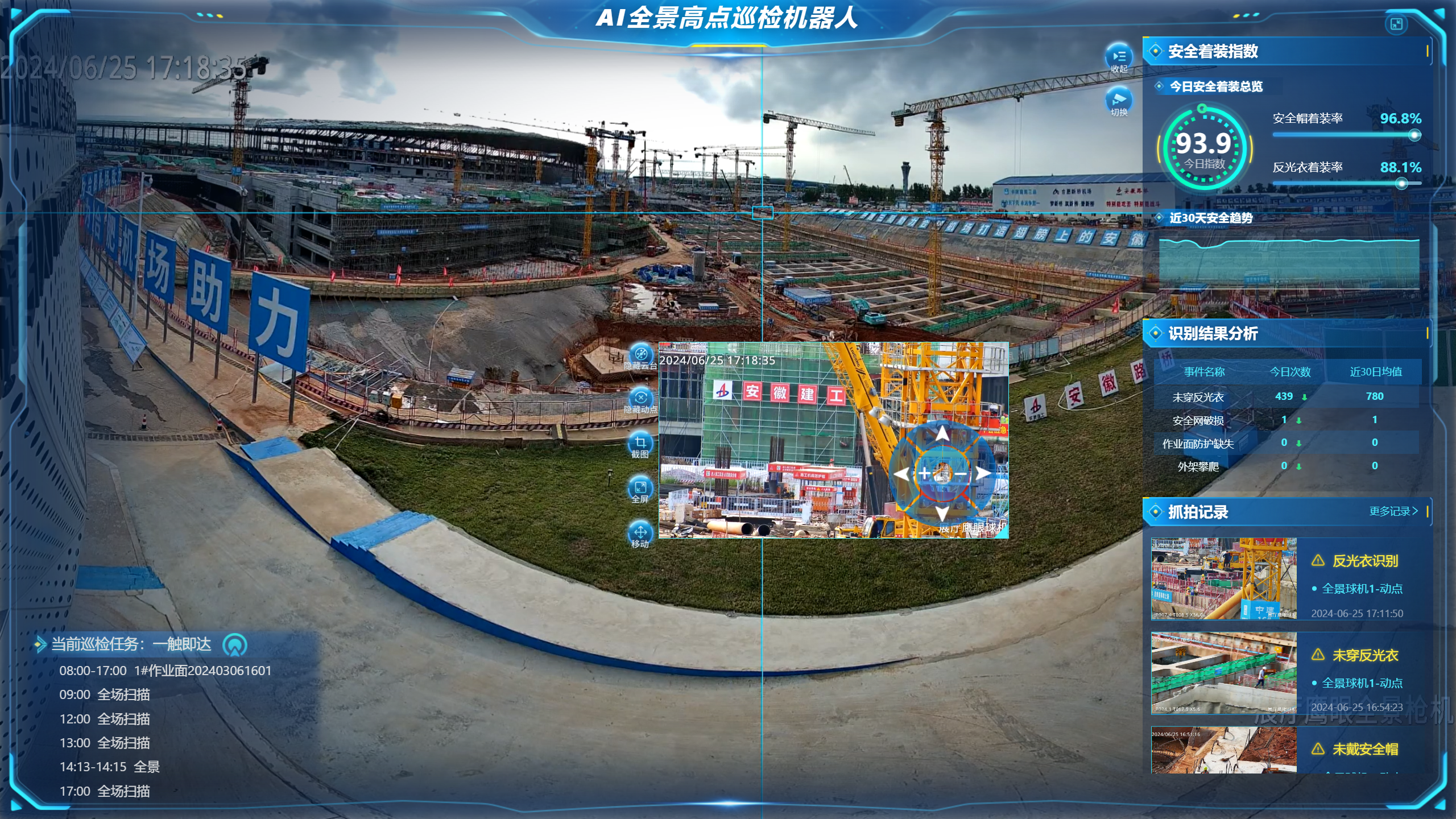 AI高點(diǎn)巡檢機(jī)器人的登場(chǎng),革新了傳統(tǒng)巡檢模式。通過運(yùn)用錐面拼接技術(shù),將傳統(tǒng)視頻監(jiān)控的視野短板一掃而空。自動(dòng)巡檢時(shí),動(dòng)點(diǎn)攝像頭精準(zhǔn)捕捉人員違規(guī)行為,對(duì)安全隱患實(shí)時(shí)抓拍記錄。結(jié)合AI算法,切實(shí)解決了人工巡檢的耗人耗時(shí)難題,同時(shí)隱患識(shí)別準(zhǔn)確率提高至98%,單項(xiàng)目巡檢成本銳減50%~70%,全程保障了“零事故”作業(yè)。
