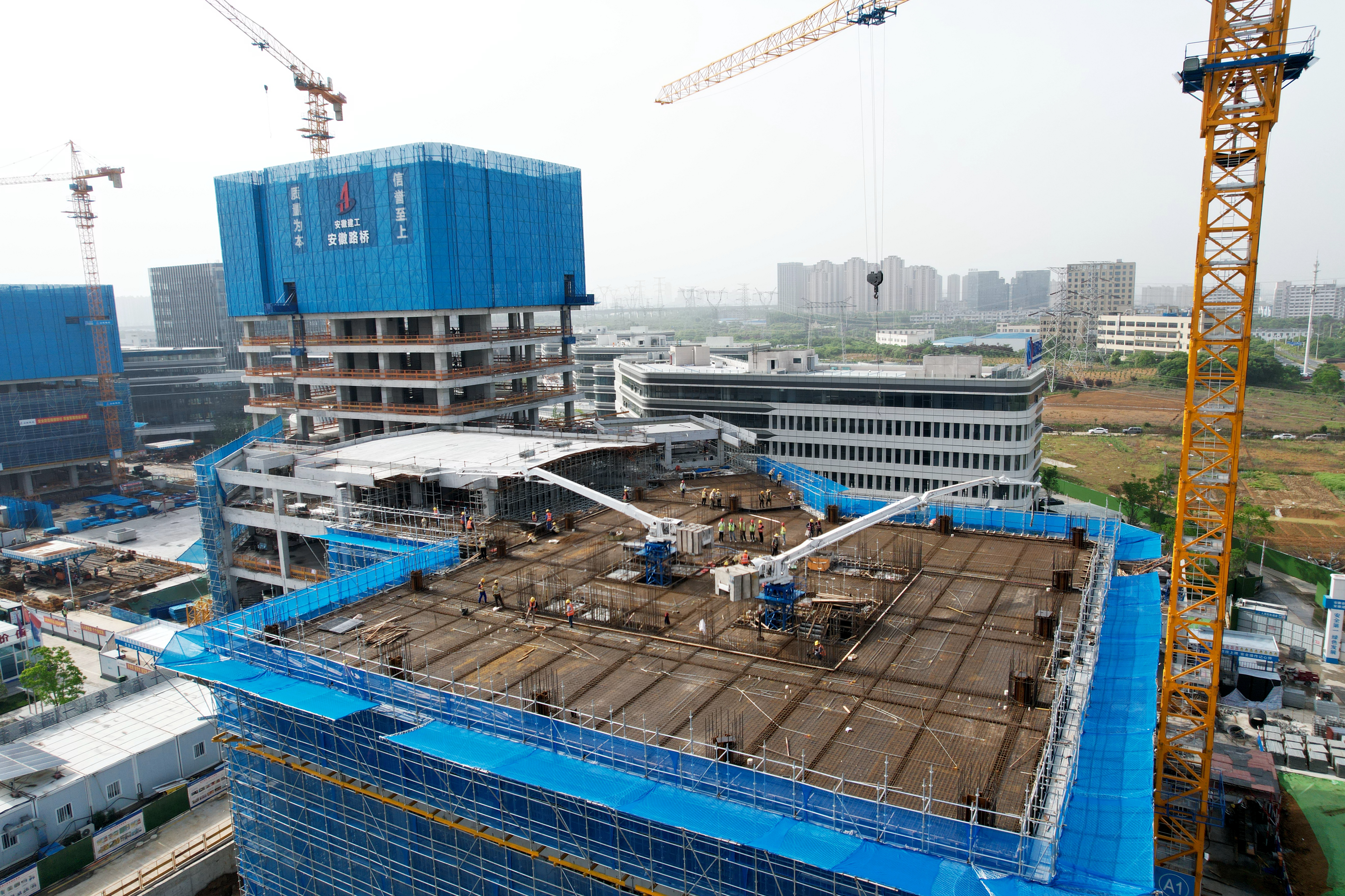 超高層混凝土與全液壓智能布料機(jī)施工技術(shù)實(shí)現(xiàn)了施工流程的智能化飛躍。布料機(jī)獨(dú)具匠心地采用3節(jié)臂“Z”形折疊設(shè)計(jì),支持人機(jī)協(xié)同可視化遙控操作,實(shí)現(xiàn)全方位無死角布料,且不占用現(xiàn)澆板面空間與塔吊設(shè)備資源,澆筑效率大幅提升近50%。這一技術(shù)已在桃花科創(chuàng)產(chǎn)業(yè)園EPC項(xiàng)目成功應(yīng)用,榮獲省級(jí)工法,并助力項(xiàng)目榮獲2023年度中國(guó)施工企業(yè)管理協(xié)會(huì)工程建設(shè)行業(yè)典型案例(智能建造)項(xiàng)目、合肥市智能建造新技術(shù)新產(chǎn)品創(chuàng)新服務(wù)典型案例。