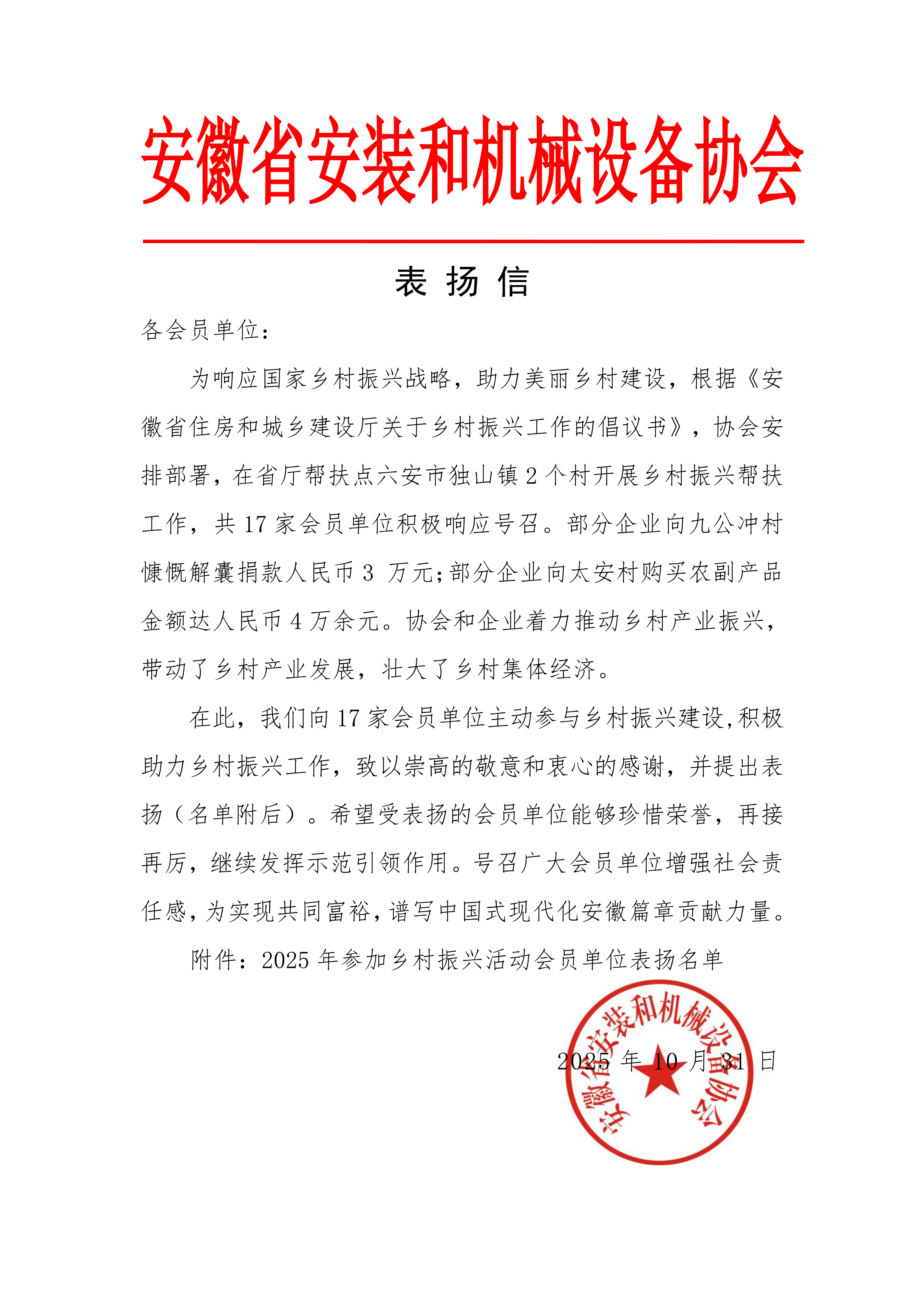 公司積極響應(yīng)國(guó)家鄉(xiāng)村振興戰(zhàn)略,助力美麗鄉(xiāng)村建設(shè),根據(jù)《安徽省住房和城鄉(xiāng)建設(shè)廳關(guān)于鄉(xiāng)村振興工作的倡議書》,協(xié)會(huì)安排部署,著力推動(dòng)鄉(xiāng)村產(chǎn)業(yè)振興,帶動(dòng)了鄉(xiāng)村產(chǎn)業(yè)發(fā)展,壯大了鄉(xiāng)村集體經(jīng)濟(jì)。——安徽省安裝和機(jī)械設(shè)備協(xié)會(huì)