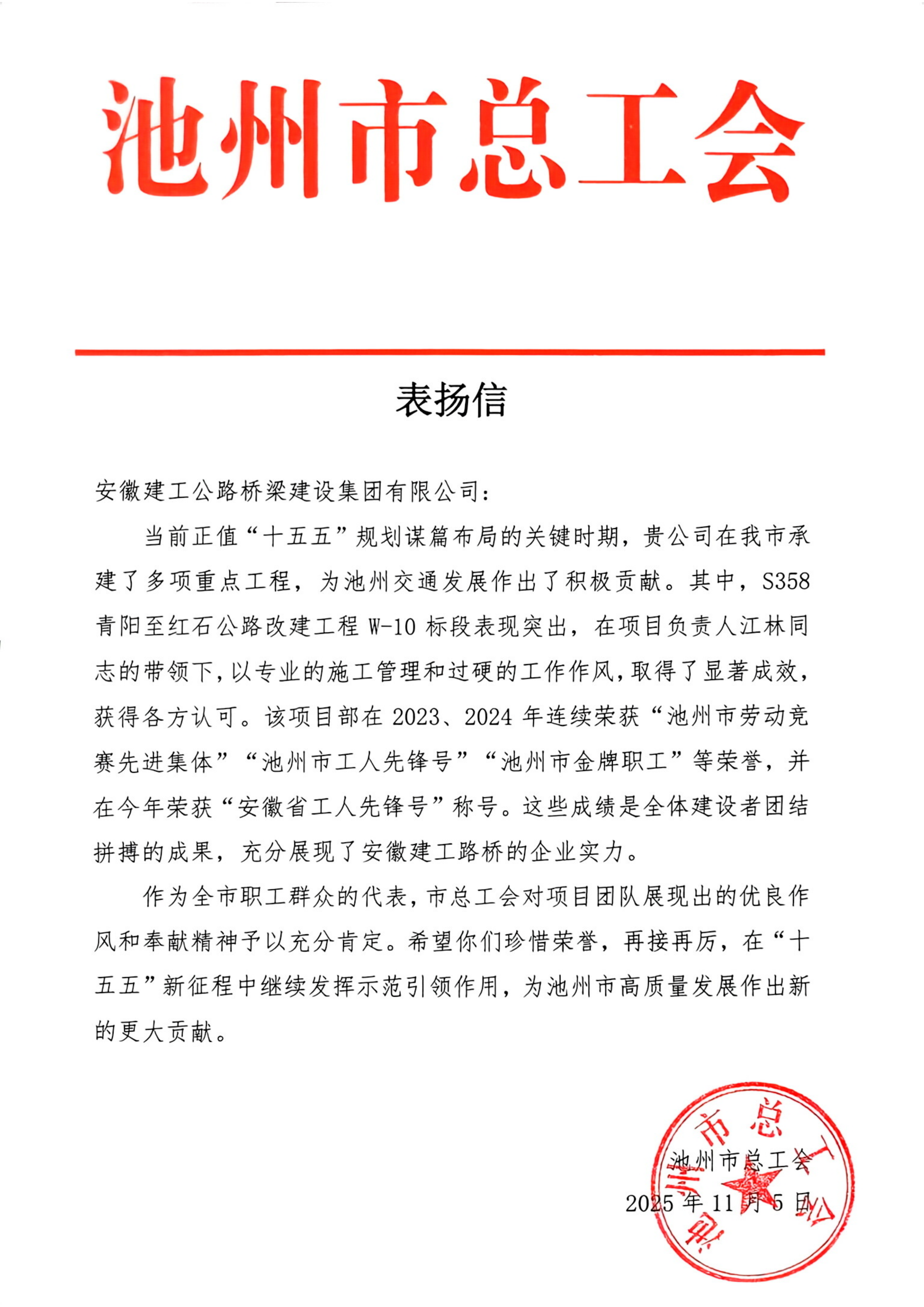 公司承建S358青陽至紅石公路改建工程W-10標(biāo)段表現(xiàn)突出,以專業(yè)的施工管理和過硬的工作作風(fēng),取得了顯著成效,獲得各方認(rèn)可?!刂菔锌偣?huì)