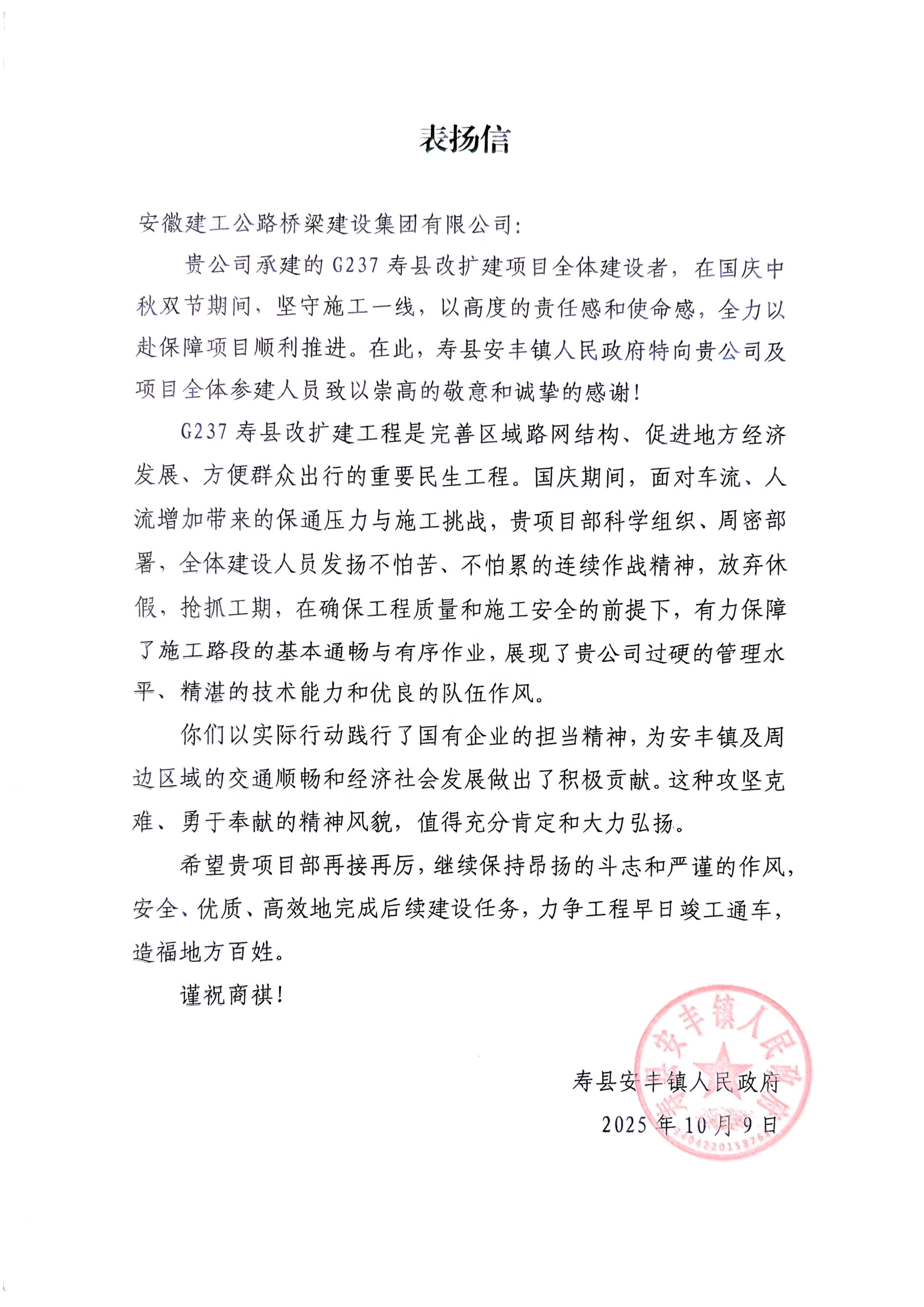 公司承建的G237壽縣改擴(kuò)建項(xiàng)目全體建設(shè)者,在國(guó)慶中秋雙節(jié)期間,堅(jiān)守施工一線,以高度的責(zé)任感和使命感,全力以赴保障項(xiàng)目順利推進(jìn)。為安豐鎮(zhèn)及周邊區(qū)域的交通順暢和經(jīng)濟(jì)社會(huì)發(fā)展做出了積極貢獻(xiàn)。——壽縣安豐鎮(zhèn)人民政府