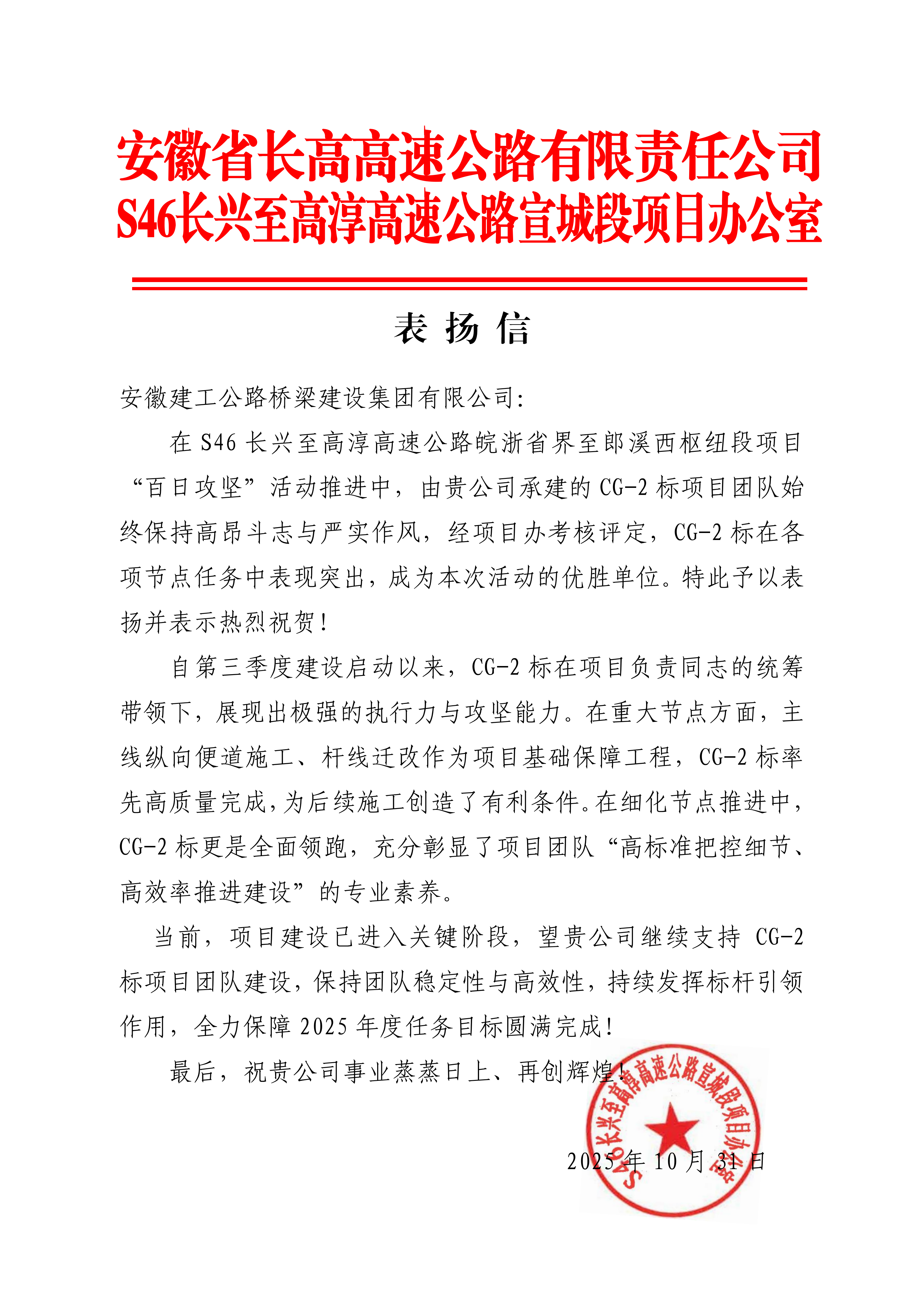 公司承建的CG-2標(biāo)項(xiàng)目團(tuán)隊(duì)始終保持高昂斗志與嚴(yán)實(shí)作風(fēng),經(jīng)項(xiàng)目辦考核評(píng)定,CG-2標(biāo)在各項(xiàng)節(jié)點(diǎn)任務(wù)中表現(xiàn)突出,成為本次活動(dòng)的優(yōu)勝單位。——安徽省長(zhǎng)高高速公路有限責(zé)任公司