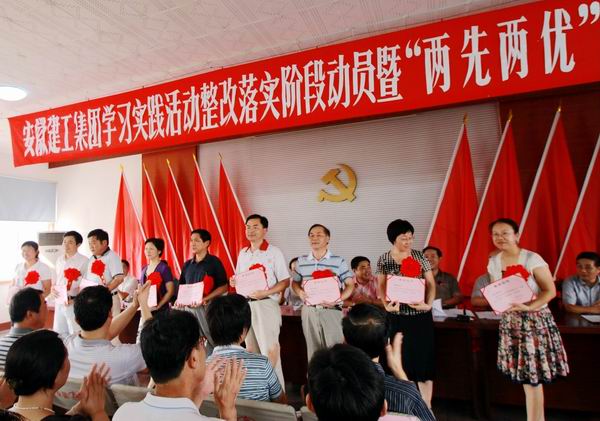 此次獲得集團先進稱號的集體、個人具體獲獎情況是:公司黨委榮獲安徽建工集團2008年度“先進基層黨委”稱號,橋梁分公司黨支部榮獲安徽建工集團2008年度“先進黨支部”稱號,公司高界高速公路改建工程06標項目、公司新蚌埠路與北二環(huán)路立交工程項目、公司合肥南一環(huán)暢通工程G標段項目分別榮獲安徽建工集團“黨員先鋒號工程”稱號,陳光磊、劉昀榮獲安徽建工集團2008年度“優(yōu)秀黨務(wù)工作者”稱號,沈壯、錢申春、劉冬榮獲安徽建工集團2008年度“優(yōu)秀共產(chǎn)黨員”稱號。