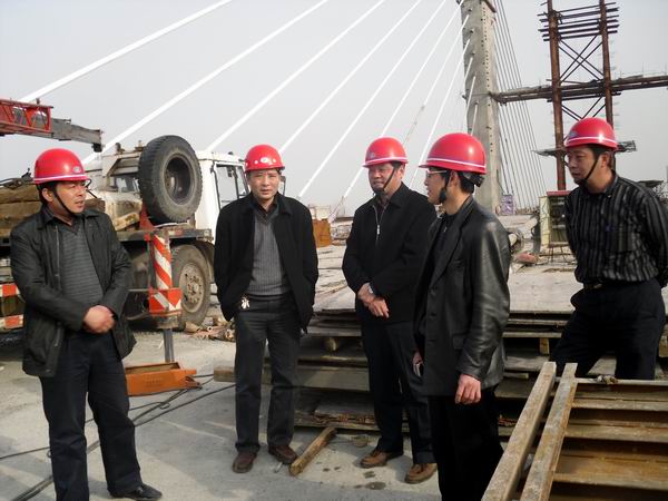 在大橋主跨施工現(xiàn)場(chǎng),項(xiàng)目經(jīng)理江仲明向戴總一行詳細(xì)匯報(bào)了工程質(zhì)量、進(jìn)度、安全控制情況。戴總對(duì)我部當(dāng)前的工程進(jìn)展情況表示滿意,希望我部再接再厲,特別是在工程收尾階段不能松懈,要一如既往的做好各項(xiàng)工作,繼續(xù)加強(qiáng)文明施工,扎實(shí)推進(jìn)項(xiàng)目精細(xì)化管理。