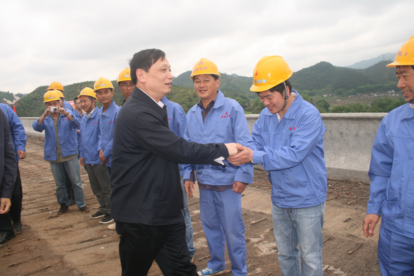 此次視察正值我標(biāo)實(shí)現(xiàn)單幅貫通之際。馬廳長一行經(jīng)全南互通區(qū)、聶徐桃江大橋、1#預(yù)制梁場(chǎng),抵達(dá)我標(biāo)桃江大橋施工現(xiàn)場(chǎng)。一下車,馬廳長便在我標(biāo)項(xiàng)目經(jīng)理羅權(quán)引領(lǐng)下來到全體在建員工面前,親切地與大家一一握手,并說道:“安徽路橋的同志們辛苦了!”隨后,在聽取了羅權(quán)的簡短匯報(bào)后,馬廳長一行對(duì)目前我標(biāo)項(xiàng)目建設(shè)情況有了進(jìn)一步的了解。針對(duì)年底建成通車的總體建設(shè)目標(biāo),馬廳長詳細(xì)詢問了后續(xù)的施工計(jì)劃,羅權(quán)表示,在各級(jí)領(lǐng)導(dǎo)的關(guān)心幫助下,安徽路橋有信心也有決心按期完成建設(shè)任務(wù)。