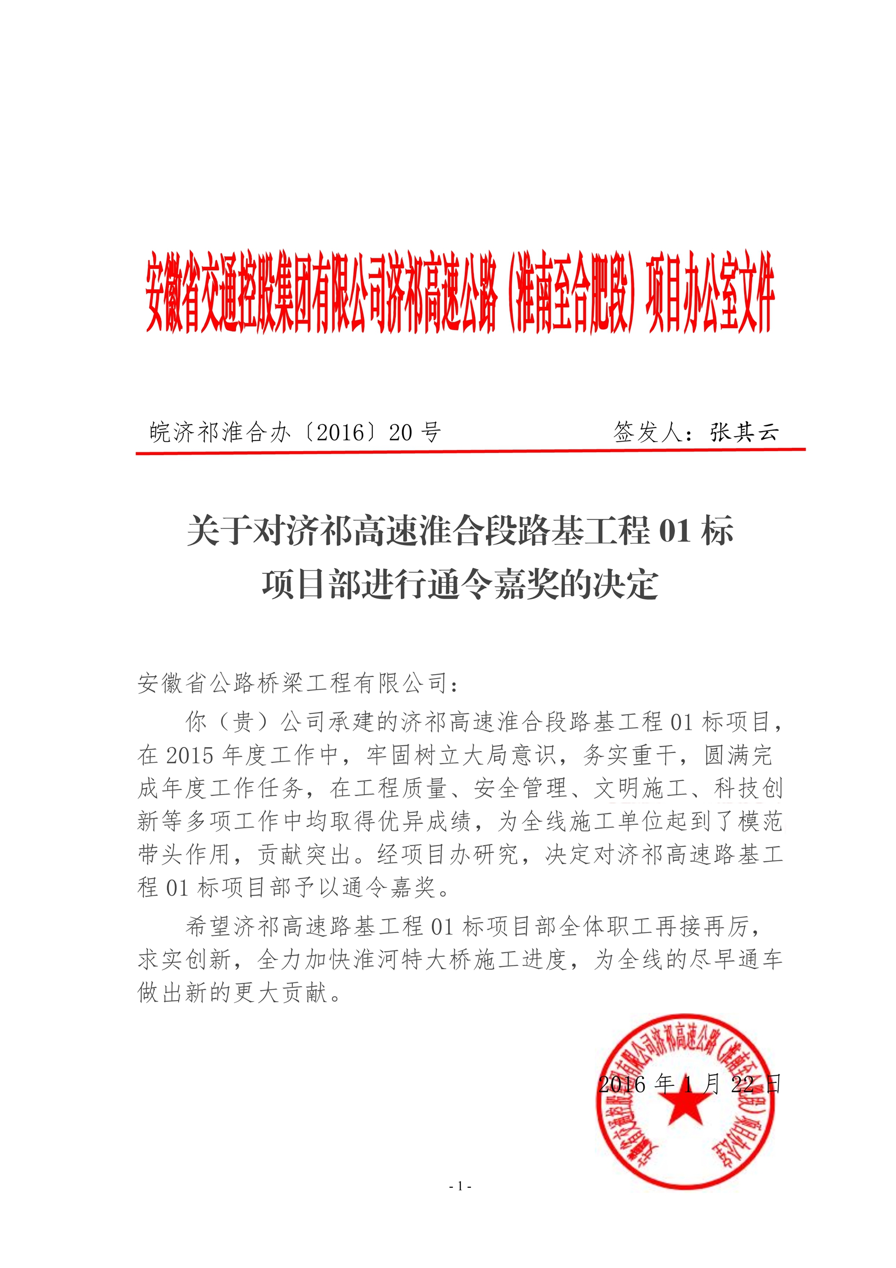 1月22日,安徽省交通控股集團發(fā)來嘉獎令,對公司承建的濟祁高速淮合段路基工程01 標項目通令嘉獎。