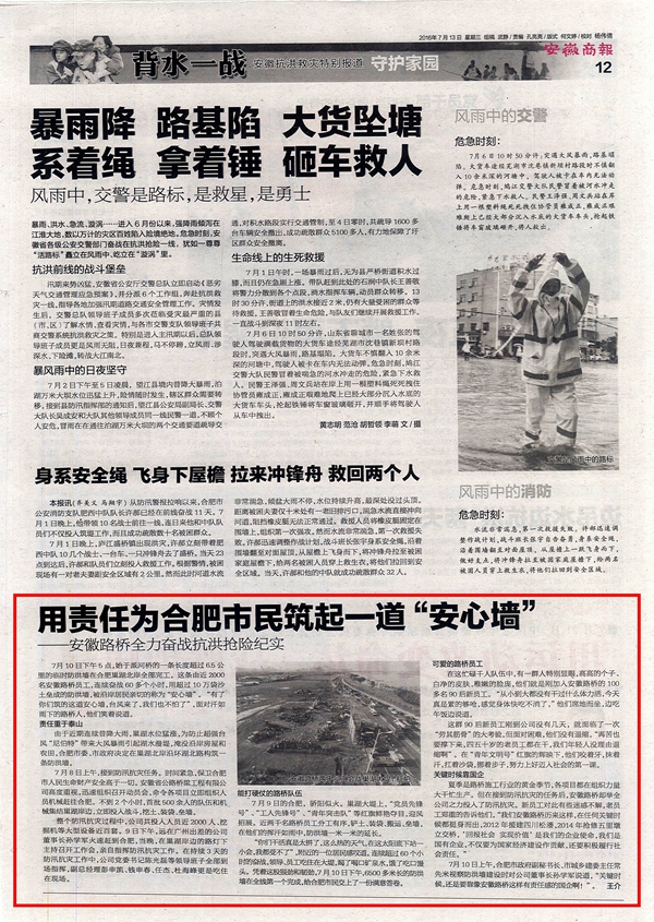 近日,公司積極響應(yīng)合肥市委、市政府號召,全力參與環(huán)湖大道和十五里河抗洪搶險(xiǎn)的事跡得到社會(huì)的高度關(guān)注。7月12日、13日,中安在線、《安徽商報(bào)》等多家省級媒體對公司抗洪搶險(xiǎn)事跡進(jìn)行了連續(xù)報(bào)道。