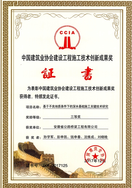 日前,中國(guó)建筑業(yè)協(xié)會(huì)公布了2017年建設(shè)工程施工技術(shù)創(chuàng)新成果獲獎(jiǎng)名單,公司組織申報(bào)的《基于不良地質(zhì)條件下的深水基礎(chǔ)施工關(guān)鍵技術(shù)研究》榮獲三等獎(jiǎng)。