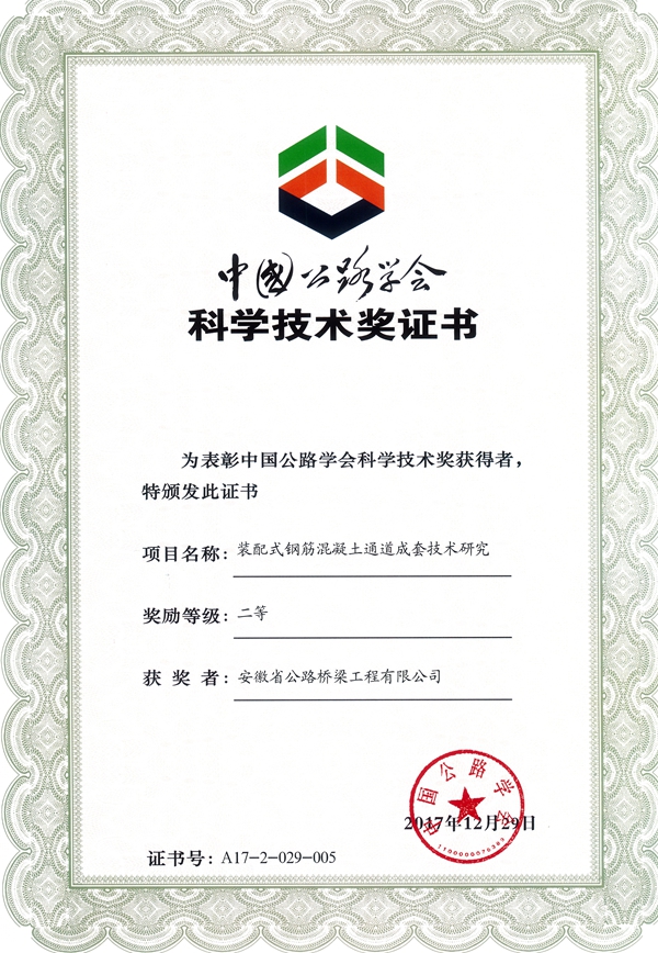 近期,“2017年度中國公路學(xué)會科學(xué)技術(shù)獎(jiǎng)?lì)C獎(jiǎng)大會”在北京召開,公司選送的《裝配式鋼筋混凝土通道成套技術(shù)研究》成果榮獲二等獎(jiǎng)。