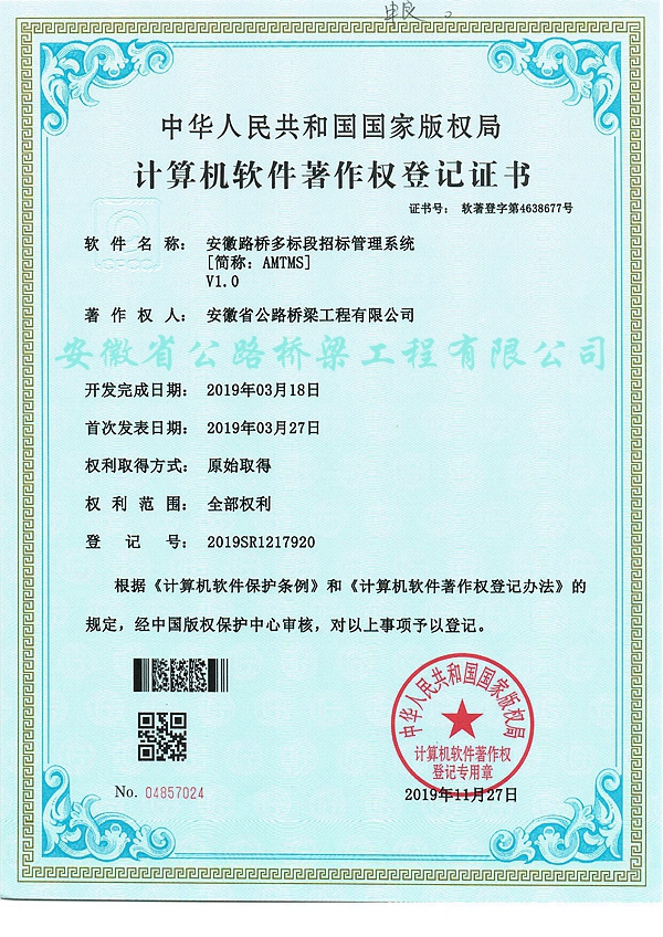 近日,《安徽路橋多標(biāo)段招標(biāo)管理系統(tǒng)V1.0》《安徽路橋關(guān)鍵績(jī)效考核管理系統(tǒng)V1.0》等五項(xiàng)管理系統(tǒng)取得國(guó)家版權(quán)局頒發(fā)的計(jì)算機(jī)軟件著作權(quán)。