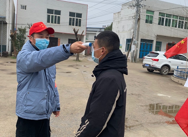 中共黨員董峰在為村民測(cè)量體溫