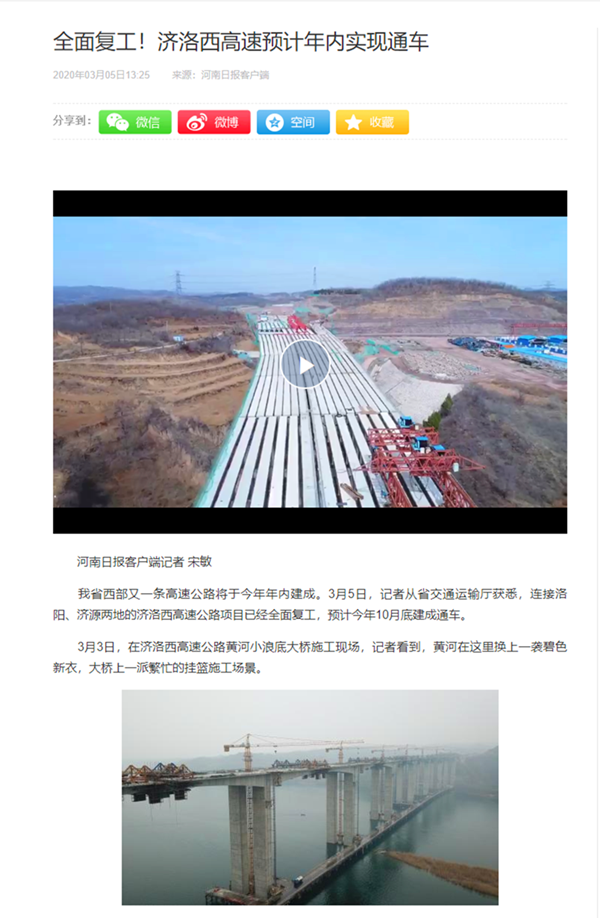 3月4日,公司承建的巢湖亞父路項目裕溪河大橋復工場景出現在人民網首頁,并刊文指出,為奪回疫情造成的停工損失,項目部嚴格落實防疫和生產要求,在保證安全質量的前提下,加班加點趕施工進度,確保大橋按期建成通車。河南衛(wèi)視、鳳凰網等多家媒體記者走進公司承建的濟洛西高速黃河特大橋項目施工現場,實地采訪項目復工復產情況,并在中國網、河南日報客戶端、大河網進行了登載。安徽網聚焦G318池州至殷匯段改建工程復工建設,《今日宣州》以《按下交通建設“快進鍵”》為題專題報道了公司宣城PPP項目在疫情防控形勢逐漸向好的態(tài)勢下,搶抓建設黃金期,優(yōu)化調整復工隊伍和施工組織計劃,把因疫情耽誤的工期搶回來,確保項目如期完工,開啟了復工建設趕進度模式。
