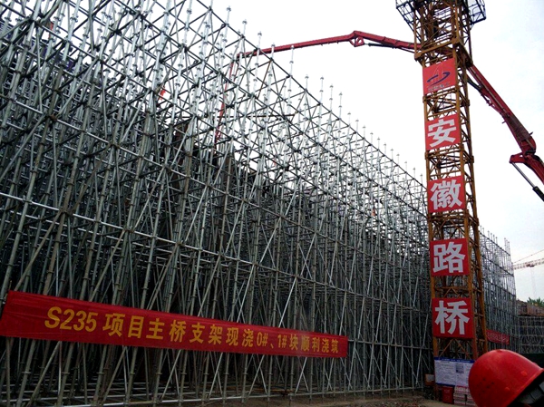 為突破原有施工方案對(duì)工程進(jìn)度的瓶頸制約,項(xiàng)目部多方聯(lián)系,充分論證優(yōu)化方案,一方面,將主橋原定的碗扣支架改為盤扣支架施工,大大加快了搭拆速度,提高了質(zhì)量與安全,有效節(jié)約了成本。另一方面,將原先的半幅現(xiàn)澆調(diào)整為全幅現(xiàn)澆方案,有效縮短了工期。