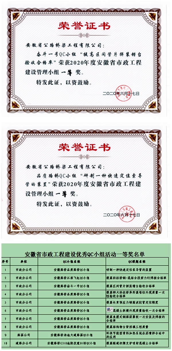 近日,2020年度安徽省市政工程建設(shè)優(yōu)秀QC小組活動(dòng)成果發(fā)布會(huì)在廬江召開。由公司選送的《環(huán)保節(jié)能型骨料加熱系統(tǒng)在瀝青拌合站中的應(yīng)用》《提高區(qū)間管片拼裝錯(cuò)臺驗(yàn)收合格率》《提高隧道初期支護(hù)噴射混凝土合格率》等10項(xiàng)課題成果經(jīng)過專家評審,榮獲一等獎(jiǎng),并選送參加全國市政工程QC成果發(fā)布。