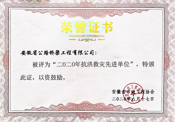 公司榮獲安徽省市政工程協(xié)會“2020年抗洪救災(zāi)先進單位”
