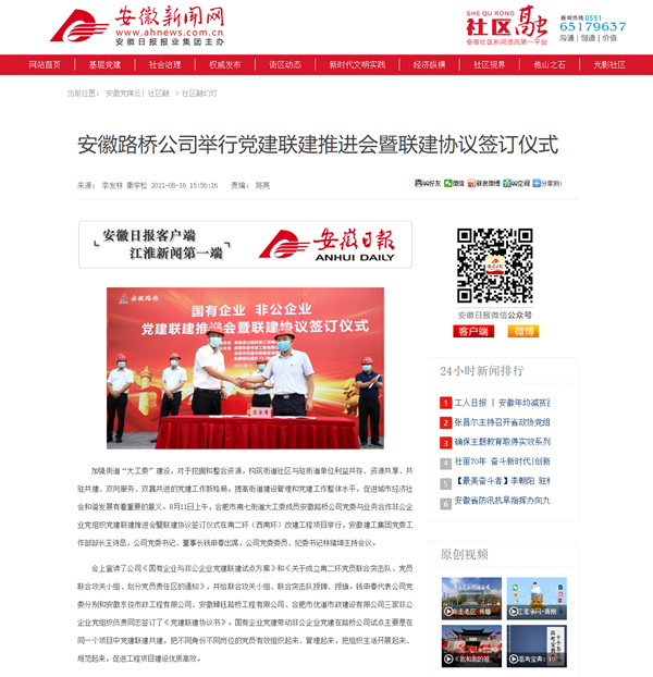【名媒聚焦】《安徽新聞網(wǎng)》報(bào)道公司國(guó)有企業(yè)與非公企業(yè)黨建聯(lián)建簽訂儀式