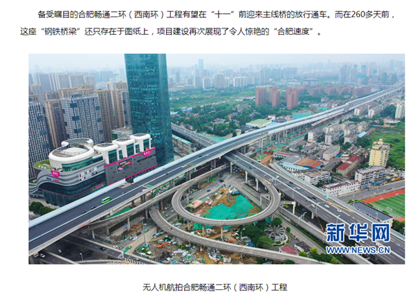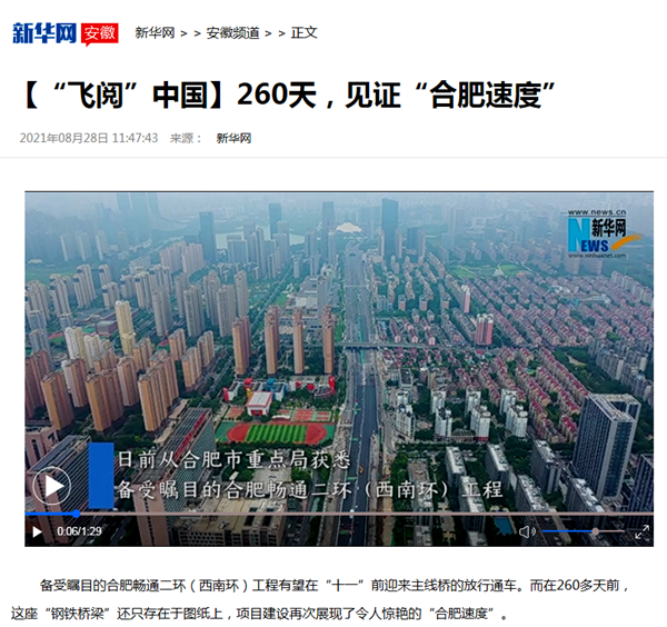 8月28日,國家級主流媒體再次聚焦公司承建的重點工程建設,《新華網(wǎng)》以《“飛閱”中國260天 見證“合肥速度”》為題,報道了公司承建的暢通南二環(huán)(西南環(huán))項目建設進展情況。
