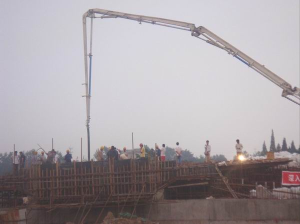 盛夏季節(jié),驕陽似火。經(jīng)項目部科學(xué)組織、精心準(zhǔn)備、合理安排,2009年6月21日上午六安市淠望路大橋工地上人頭攢動、機器轟鳴,兩臺混凝土泵車高高聳立在大橋主墩0#塊上面。九時許,經(jīng)現(xiàn)場監(jiān)理組和業(yè)主驗收后,淠望路大橋主墩0#塊開始澆注混凝土,現(xiàn)場施工人員克服高溫酷暑天氣,經(jīng)過個5個多小時的連續(xù)奮戰(zhàn),于當(dāng)天下午三點順利完成混凝土的澆筑工作。
