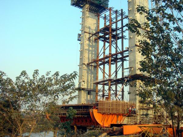 六安淠望路大橋主跨長120米,共有15個節(jié)段,最大節(jié)段長10米,寬35米,重410噸。普通節(jié)段長7米、寬27米、重300噸。由于節(jié)段長、重量大,普通掛籃不能滿足施工要求,按設計要求采用前支點掛籃,掛籃的前端支點利用斜拉索掛制于索塔。施工過程中前點荷載均由斜拉索承受,澆注混凝土時,通過調整索力來調整掛籃高程。本項目采用的前支點掛籃,掛籃長18米、寬30米、重166噸,此種掛籃施工工藝在公司尚屬首次。