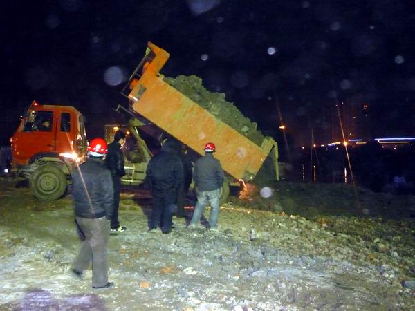 當(dāng)12月19日,宋斗灣路完成第一根樁(位于南淝河北側(cè),屬于3#橋臺(tái))的開挖澆注工作后,項(xiàng)目經(jīng)理部就開始籌劃南淝河南側(cè)的筑島圍堰工作。12月24日,當(dāng)3#橋臺(tái)的六根樁全部澆注完成后,當(dāng)天晚上仍繼續(xù)前一晚的筑島工作。每次筑島時(shí),現(xiàn)場橋梁技術(shù)員、測量技術(shù)員和安全員都和工人們一起奮戰(zhàn),而每次奮戰(zhàn)都是一個(gè)通宵。截至25日,南淝河筑島圍堰共計(jì)用土近270車,約4600方,筑島面積和筑島深度達(dá)到預(yù)案和監(jiān)理要求,符合現(xiàn)場施工的實(shí)際要求。至此,筑島圍堰工作圓滿完成。