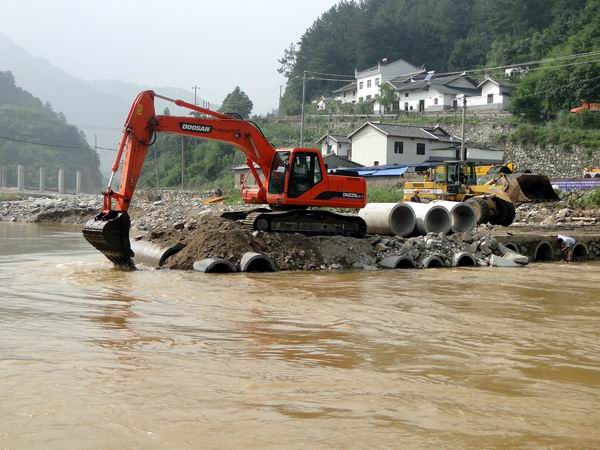 從27日開始,天氣放晴,水位下降,我部抓住機會進行第三次搶修,一臺挖機、一臺裝載機和五臺運輸車同時作業(yè),終于在28日上午打通便橋。項目部迅速組織人員把施工設(shè)備、施工材料調(diào)運到對面,28日下午恢復(fù)小型結(jié)構(gòu)物施工。